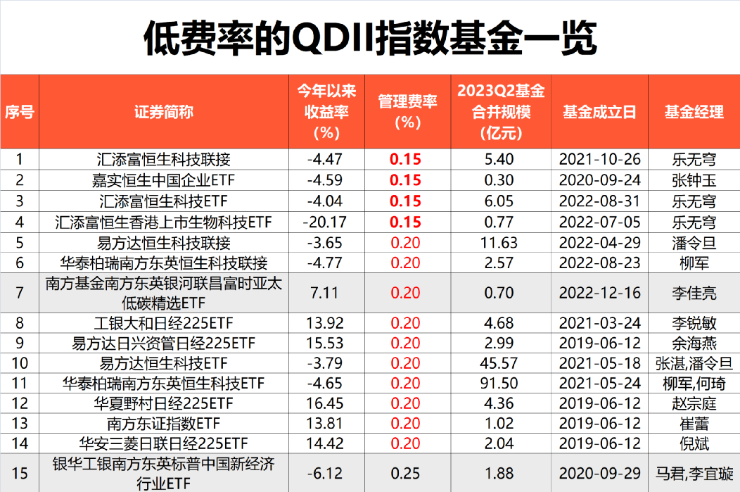 总体来看,目前管理费在0.5%以下QDII指数基金占比11.5%,低费率基金主要出现在恒生科技、日经指数等同质化竞争激烈的产品中。多家机构人士认为,未来低费率基金有望继续扩容。