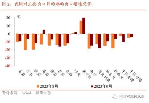 出口目的地:9月我国对多个主要出口目的地的出口增速均出现了跌幅收窄,俄罗斯、英国、印度对我国出口增速形成明显的正向拉动作用,东盟对我国出口增速拖累最大。