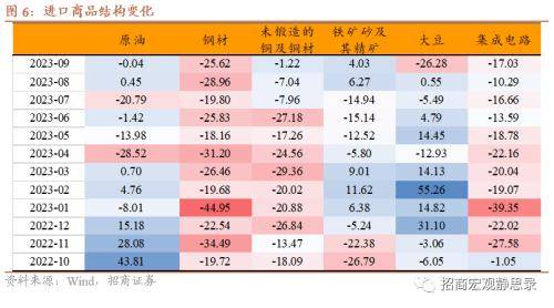 进口:9月进口增速跌幅继续收窄的主要原因是去年进口基数低叠加部分大宗商品进口增速跌幅有所缓和,铁矿砂、铜矿砂进口金额增速维持正值。
