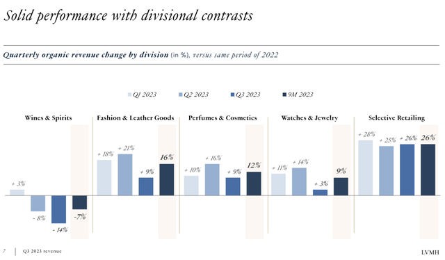 其中,颓势最为明显的是“酒品和烈酒”板块,该板块业务主要包括2021年合并的黑桃A香槟、轩尼诗、酩悦香槟,以及多年来合并的北美和欧洲众多酒庄。第三季度,酒品和烈酒板块营收有机增速为-14%,是分析师一致预期2.79%的约5倍,也超过今年上半年的-3%。