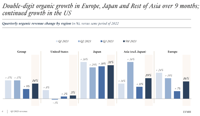 值得重点关注的是包括中国在内的亚洲市场,第三季度营收有机同比增速从第二季度的34%降至19%。这或印证了摩根大通研报中的预言:“疫情解封前期的消费热潮正在褪去”。