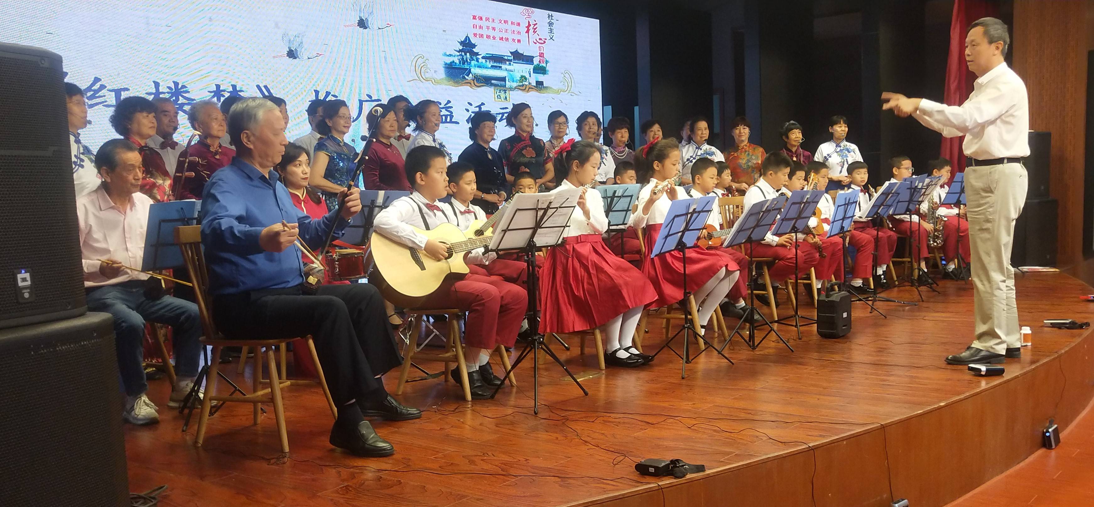 赠书仪式结束后,进入文艺演出环节。江苏红学会监事徐德朗诵《红楼梦》葬花吟,声情并茂,赢得了阵阵掌声。随后民盟同心同行合唱团、民盟同心同行儿童小乐队与韩中英副会长合作,在江苏红学会理事徐众老师指挥下表演《枉凝眉》、《核心价值观》,受到大家的欢迎。