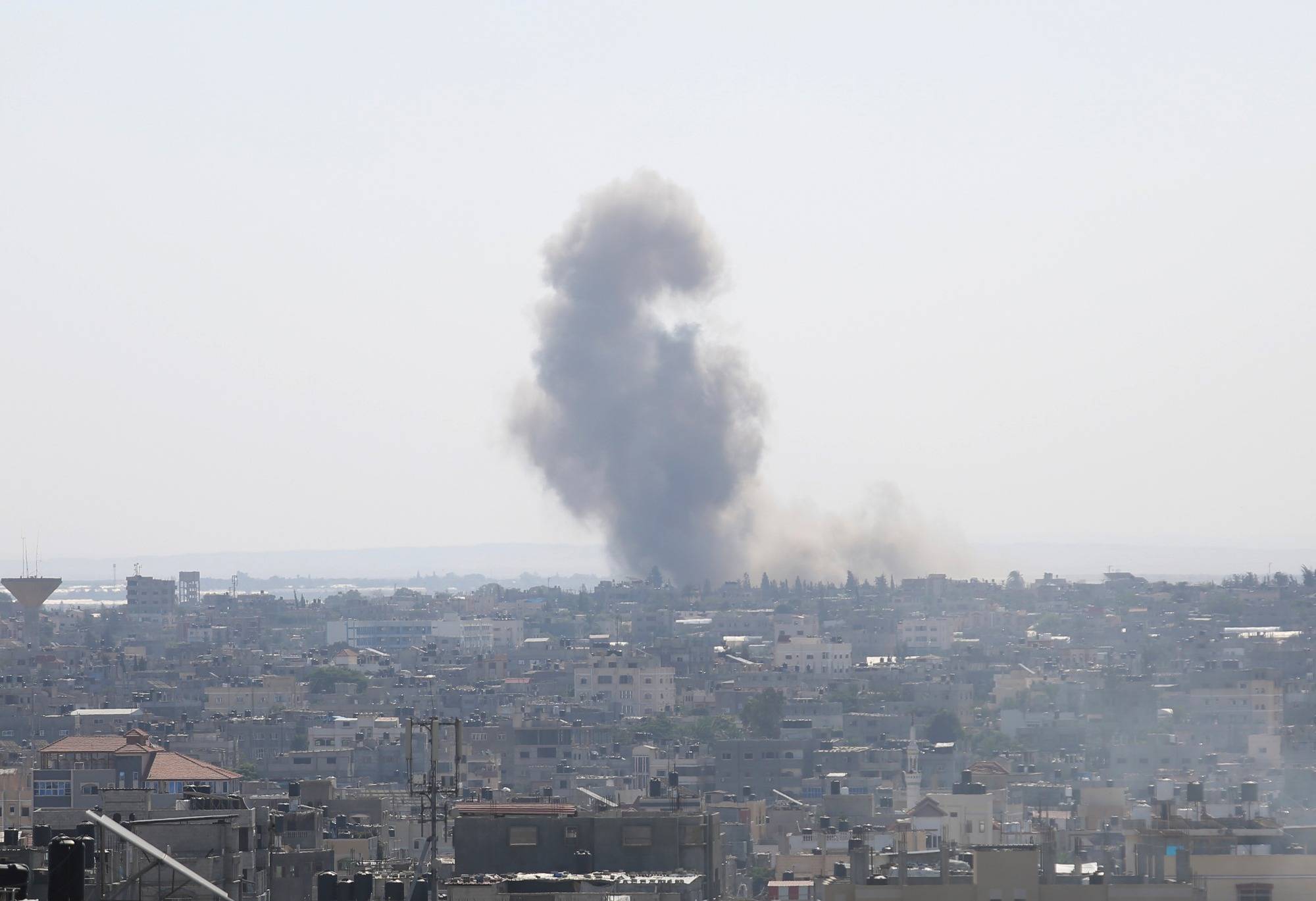 10月15日,在加沙地带南部城市拉法,建筑遭以色列空袭后冒出浓烟。新华社发(哈立德·奥马尔摄)