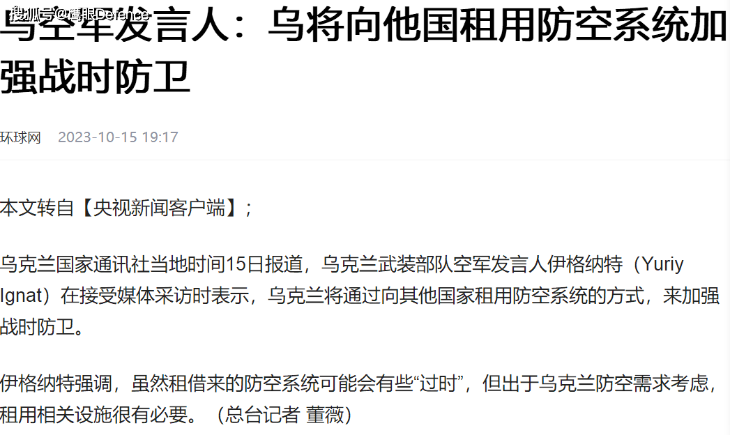 “央视新闻客户端”援引乌克兰国家通讯社报道,乌克兰武装部队空军发言人尤里·伊格纳特中校在接受媒体采访时,称乌克兰将通过向其他国家租赁防空系统的方式,来加强战时防卫,虽然租借来的防空系统可能会有些“过时”,但出于乌克兰防空需求考虑,租用相关设施很有必要。“不好意思,我不能透露哪些国家,这些信息很敏感,合作伙伴不希望我们说出来。”