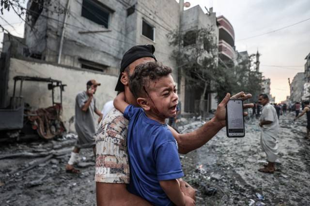 10月9日,加沙地带一处难民营,以色列空袭后,一名巴勒斯坦儿童受伤。